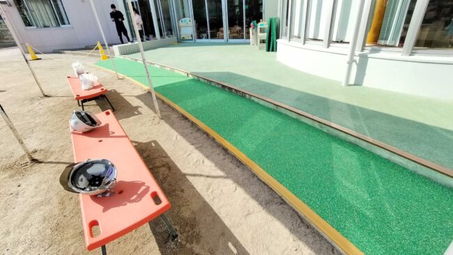 大阪府吹田市の公園施設様にて、安全対策のゴムチップ舗装をさせて頂きました。 滑り台の下は傾斜がついているので、コンクリートや土だと滑ってしまうこともありますが、ゴムチップ舗装なら衝撃吸収と滑り止めを同時に兼ねているので、…