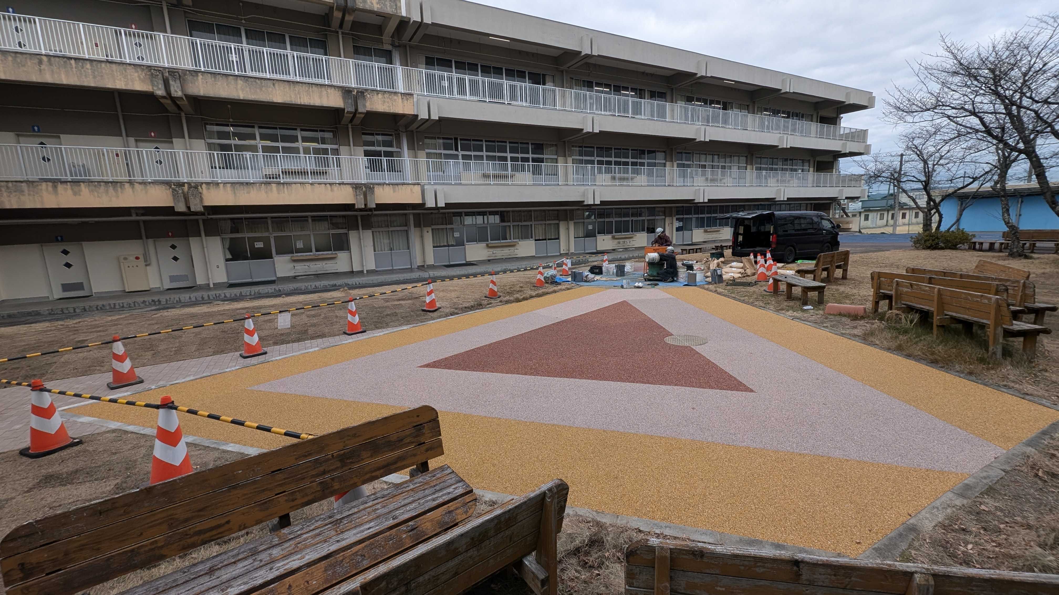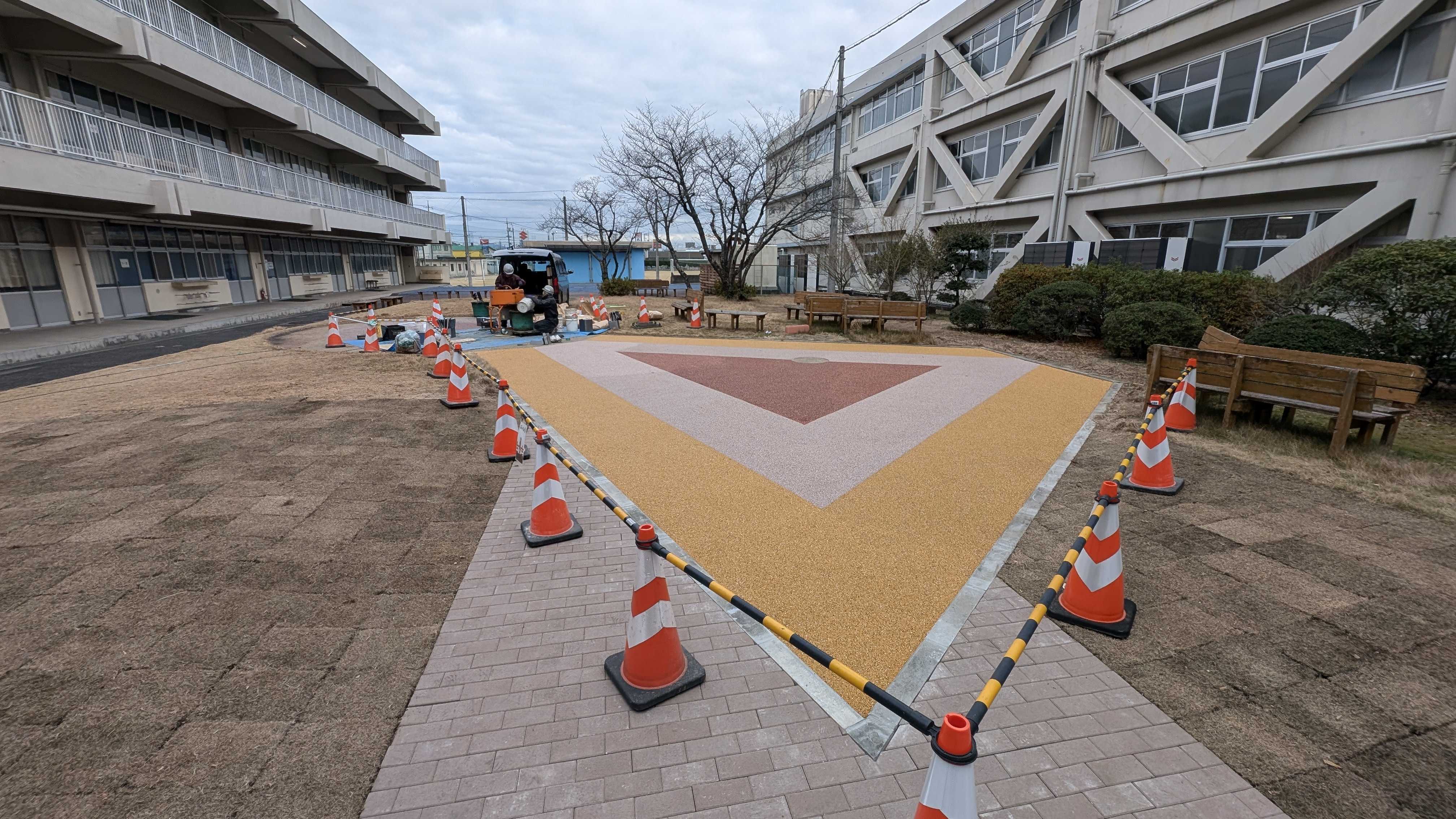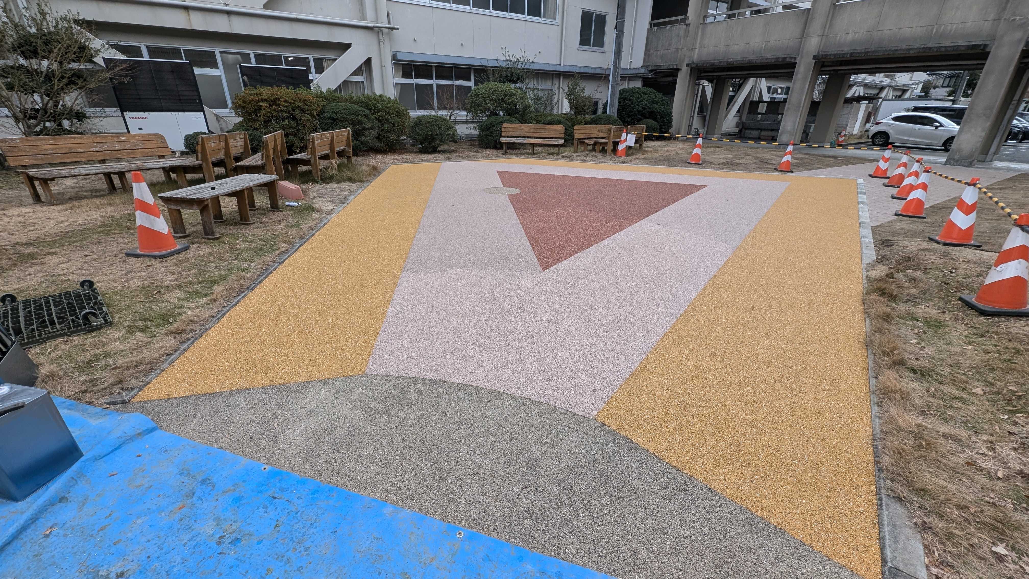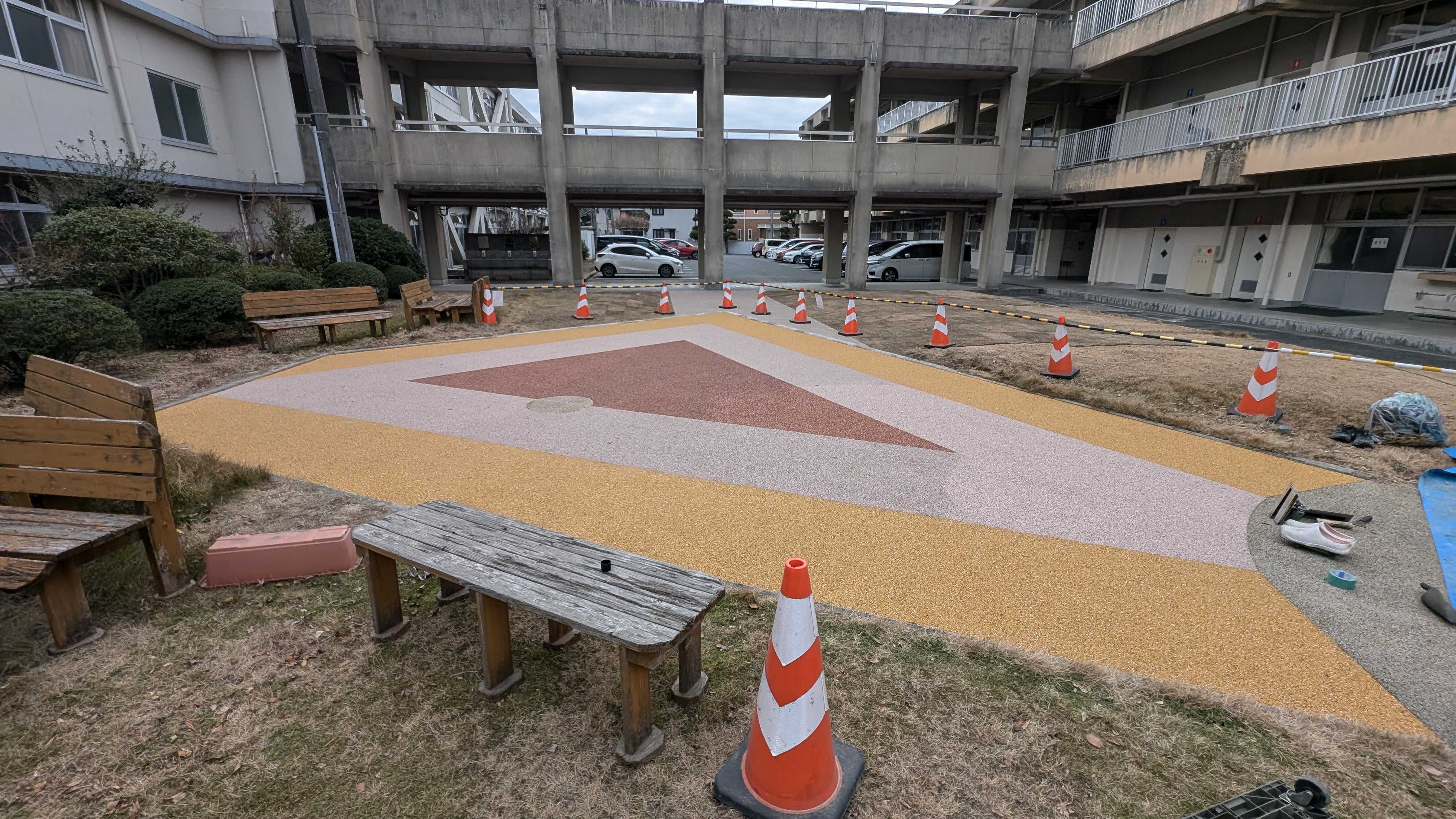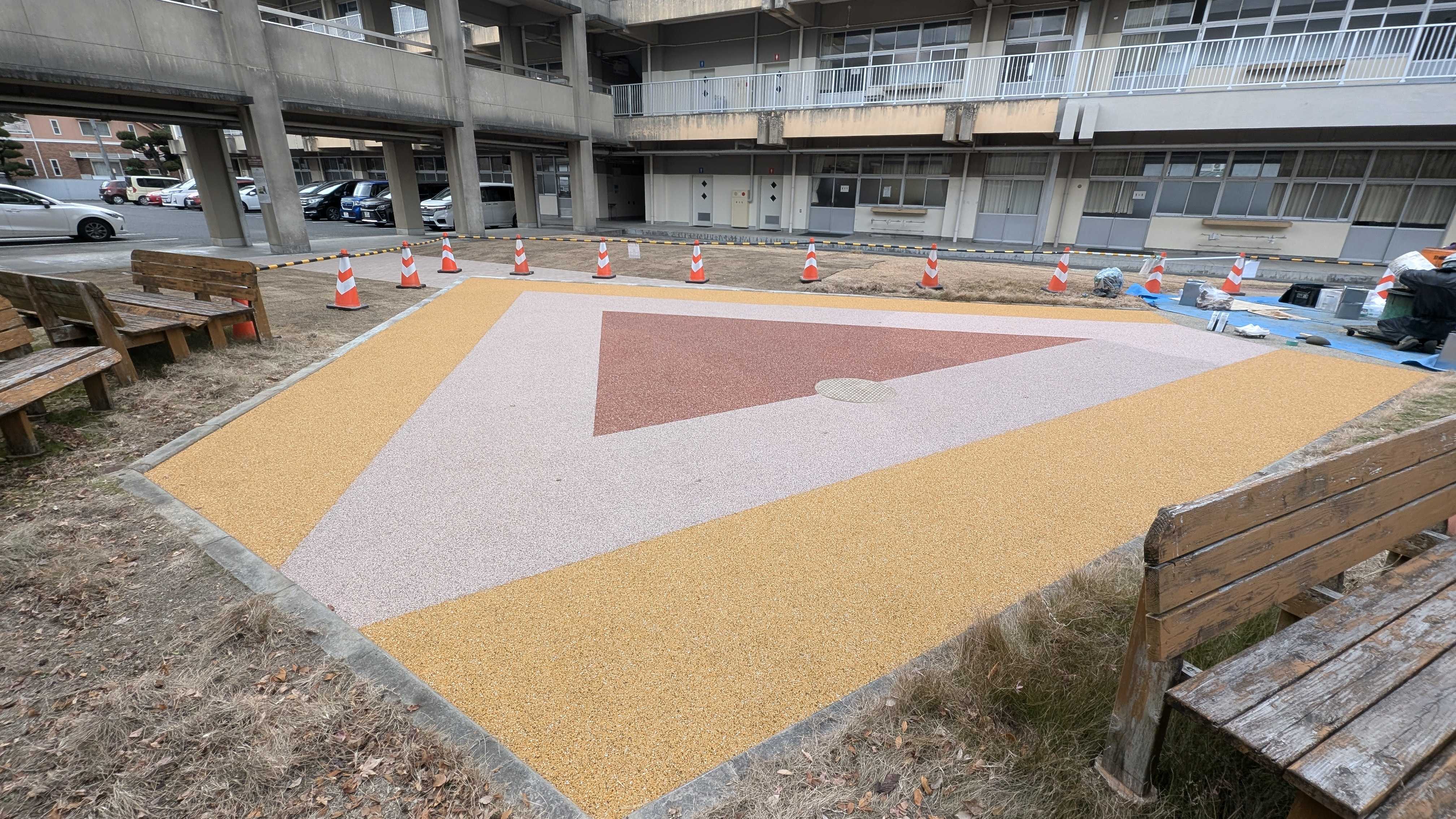 三色打ち分けの広場はお弁当を食べたり、学業のリフレッシュの場所にきっとちょうどよいですね!特注の混合色なので、汚れも目立ちにくくてとても良い仕上がりとなりました!