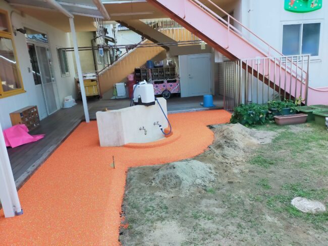 和歌山県岩手市の既設保育施設様にて、ゴムチップ舗装をさせて頂きました。 中庭が土だったのですが、草が生えたりぬかるんだりしていたようです。 まだ小さなお友達にはお洋服が汚れてしまったり虫に噛まれてしまったりするので遊べず…